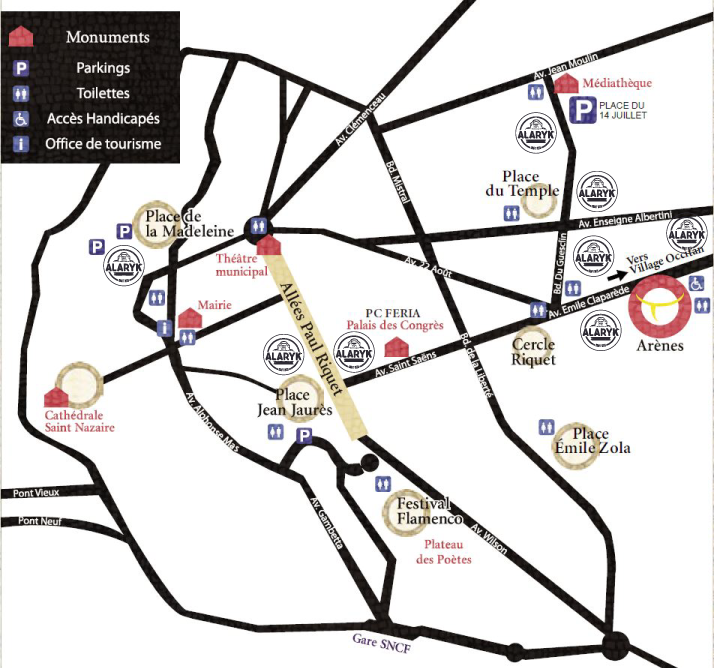 Côté Arènes : Le Caveau des Arènes, Bodega Yolo, La Marjolaine, Les Franciscains, La Villa Guy, Vilatge Occitan – Calandretas Besierencas, Epicerie Lauze